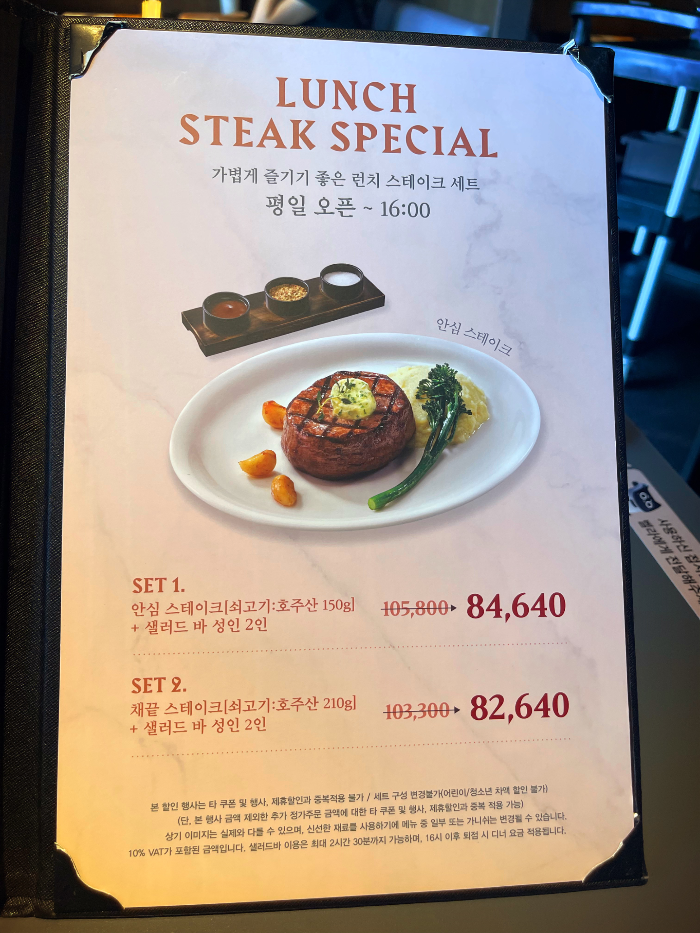 런치 먹을때 할인된 가격으로 스테이크세트 주문 가능합니다.