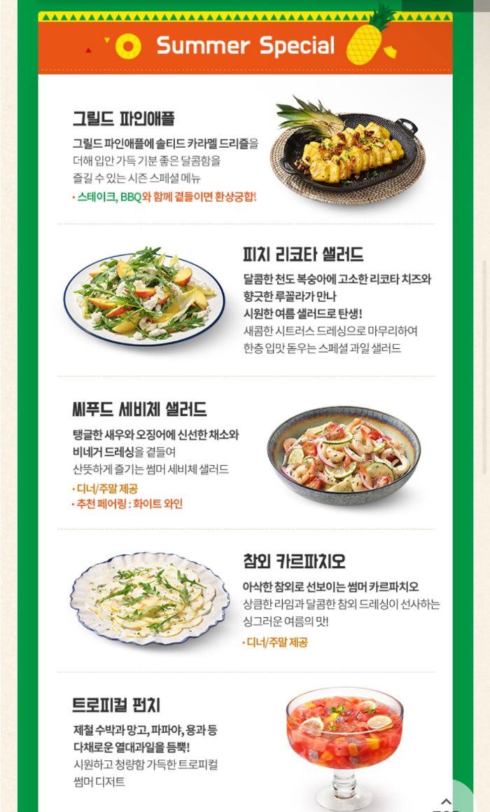 포크벨리 / 멕시칸 크리스피 쉬림프 / 크럼블 바비큐 폭립 / 트로피컬 살사 로스트 치킨 / 그릴드 파인애플 / 피치 리코타 샐러드 / 시푸드 세비체 샐러드 / 참외 카르파치오 / 트로피컬 펀치 /
