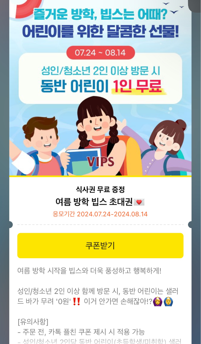 빕스 어린이 무료 쿠폰