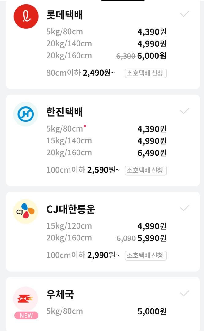 1) 롯데택배 5kg까지 4390원 20kg까지 4990원(부피크면 6천원됨)