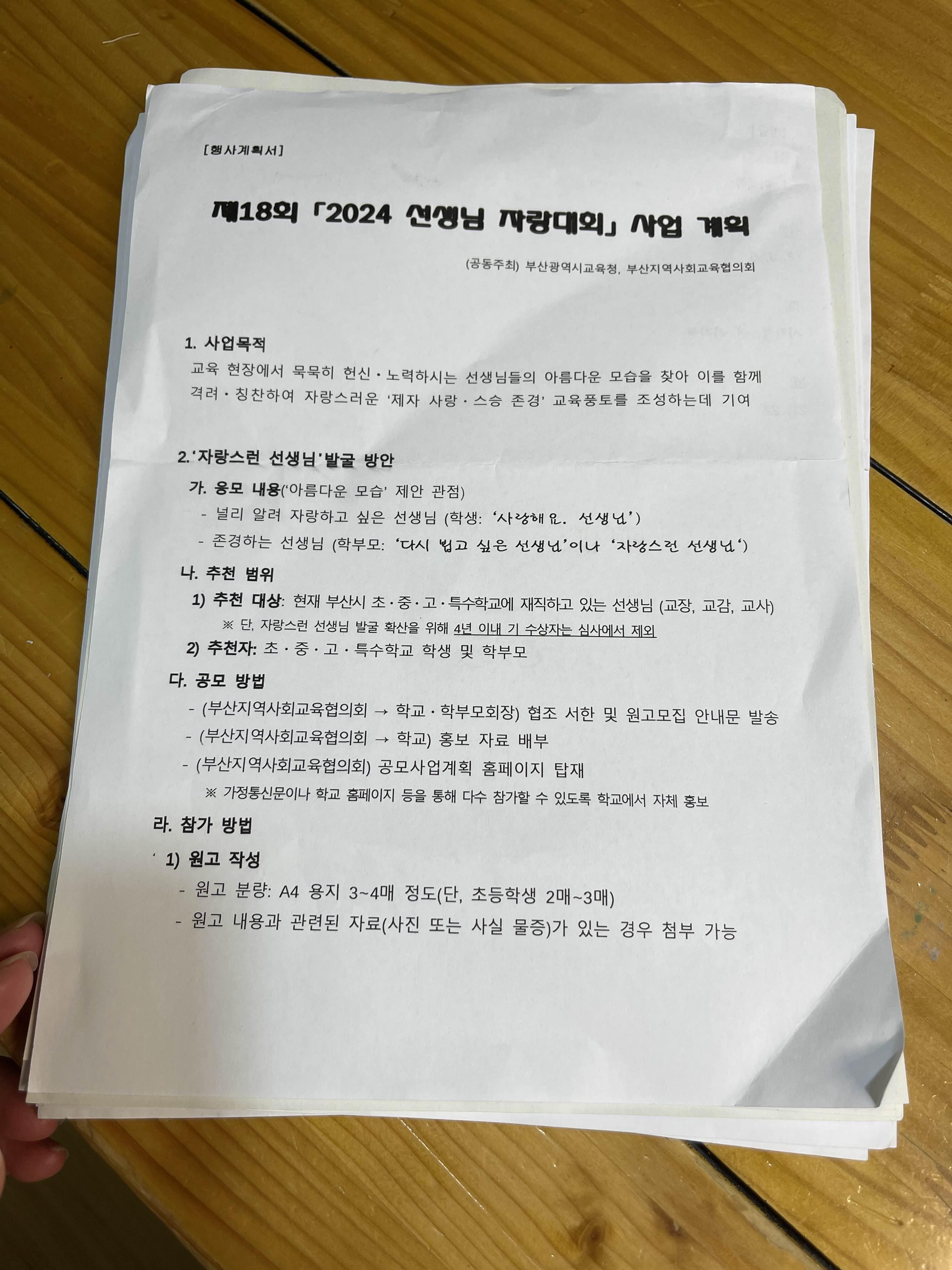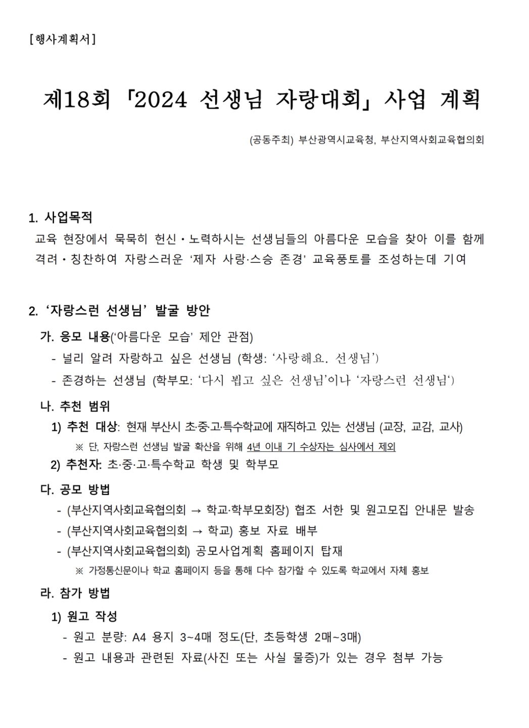 우리 교육청과 부산지역사회교육협의회가 공동 주최하는《2024 선생님 자랑대회》개최를 다음과 같이 알려드리니, 많은 학생과 학부모들이 참여할 수 있도록 안내하여 주시기 바랍니다.