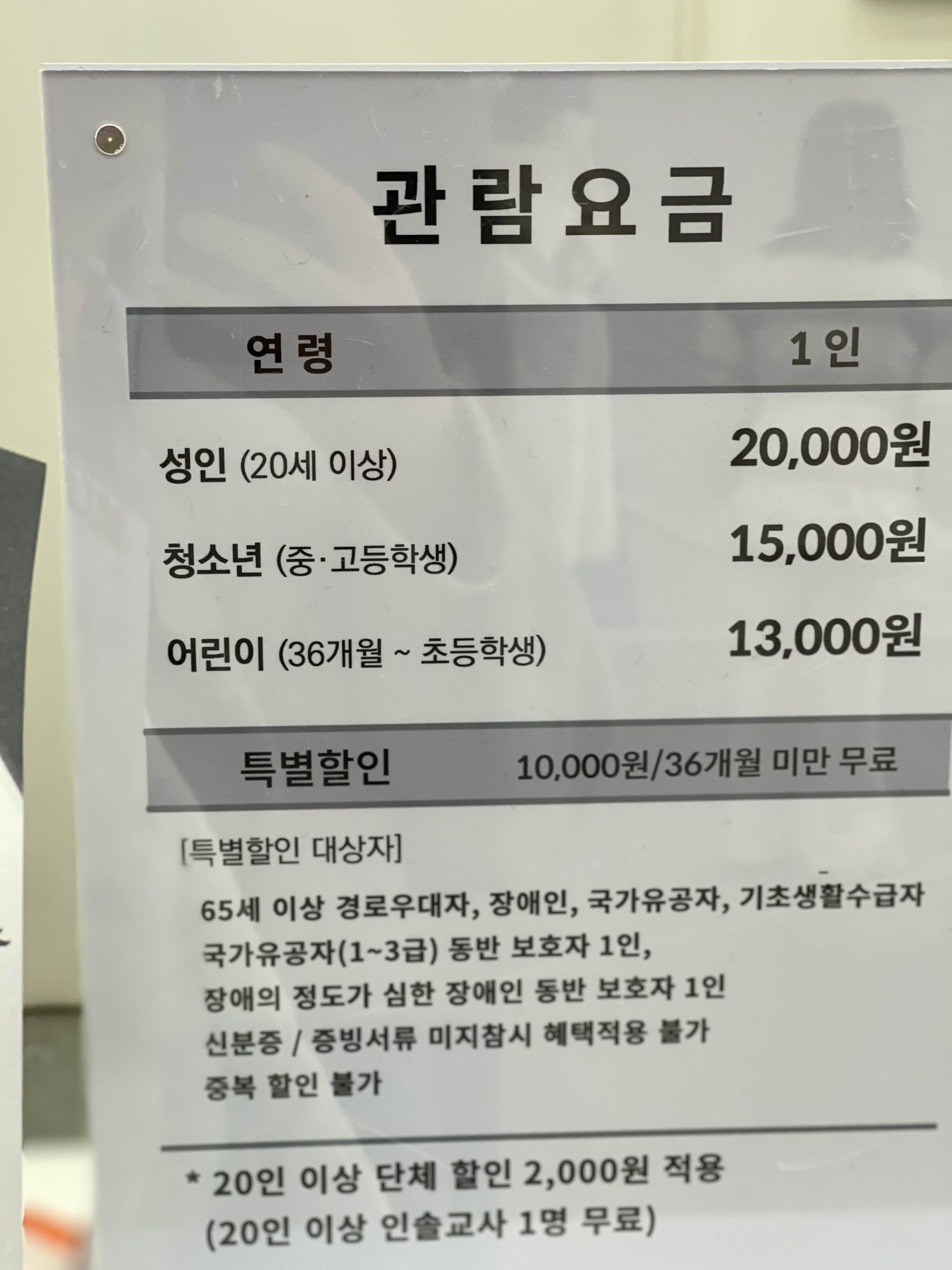 •국가유공자(1~3급) 동반 보호자 1인, 장애의 정도가 심한 장애인 동반 보호자 1인 할인 및 무료 입장은 본인에 한하여 적용되며, 신분증 또는 증빙서류 미지참 시 혜택불가 할인과 무료입장은 중복혜택 적용 불가