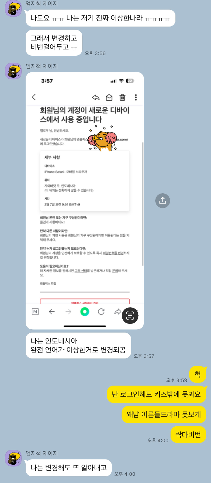 그래도 저는 넷플릭스에 각 구성원이 다 비밀번호가 걸려있어요 함께 보던 이들 모두 개개인의 비밀번호를 가지게 했어요