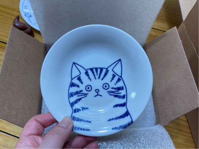 우윳빛 도자기 위 귀여운 고양이 일러스트
