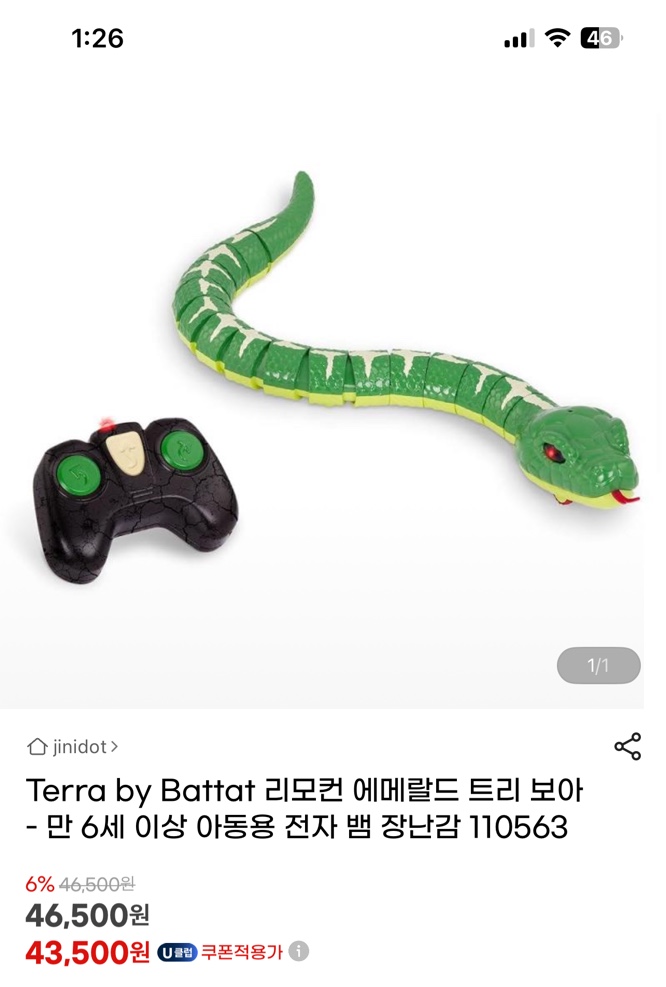 | Terra by Battat 리모컨 에메랄드 트리 보아 - 만 6세 이상 아동용 전자 뱀 장난감 Terra by Battat Remote Control Emerald Tree Boa - Electronic Snake Toy for Kids Ages 6+ 상품주요정보 적외선 리모컨을 사용할 때 뱀이 바닥을 따라 미끄러지는 것을 지켜보세요. 배터리가 필요합니다. 이 뱀에는 AAA 배터리 5개가 포함되어 있어 뱀을 사용할 수 있습니다. Terra by Battat의 반짝이는 에메랄드 나무 보아를 가지고 놀면서 몇 시간 동안 즐겁게 놀 수 있습니다. LED 눈에 불이 들어와서 이 뱀이 당신을 향해 오는 것을 놓칠 수 없습니다. 이 원격 제어 뱀은 실제 에메랄드 나무 보아와 동일한 밝은 녹색 표시와 뱀 가죽을 가지고 있습니다. 뱀은 사실적인 S 방향 움직임으로 실제 뱀처럼 움직입니다. 리모컨에는 쉽게 사용할 수 있도록 라벨이 붙어 있습니다. 버튼을 누르기만 하면 뱀이 미끄러지고 바닥을 가로질러 움직입니다. 설명서(한글이 아닐 수 있음)가 함께 제공됩니다. 만 6세 이상 어린이에게 적합합니다. 상세설명 Hissssss! 뱀이 몸을 향해 미끄러지는 것을 조심하세요. Terra by Battat의 에메랄드 트리 보아는 LED 조명 눈으로 바닥을 가로질러 미끄러져 몇 시간 동안 아이를 즐겁게 할 것입니다. 뱀은 실제 뱀과 비슷한 S 방향 움직임으로 미끄러집니다. 밝은 녹색 뱀가죽 색상과 패턴조차도 실제 에메랄드 나무 보아와 비슷합니다. 적외선 리모컨은 뱀을 좌우로 또는 앞뒤로 향하게 할 때 사용하기 쉽습니다. 배터리가 포함되어 있습니다(AAA 배터리 5개 필요). 상상력이 풍부한 놀이 시간에 이 뱀을 가지고 놀 때, 아이는 에메랄드 나무 보아가 사는 열대 우림으로 이송됩니다. 카펫이나 야외에서 사용하기에 적합하지 않습니다. 만 6세 이상 어린이에게 권장합니다. 자연과 야생 동물에 대한 자녀의 관심을 불러일으키세요! 동물 피규어, 놀이 세트, 공룡 등의 전체 라인을 확인하세요. Terra by Battat. |