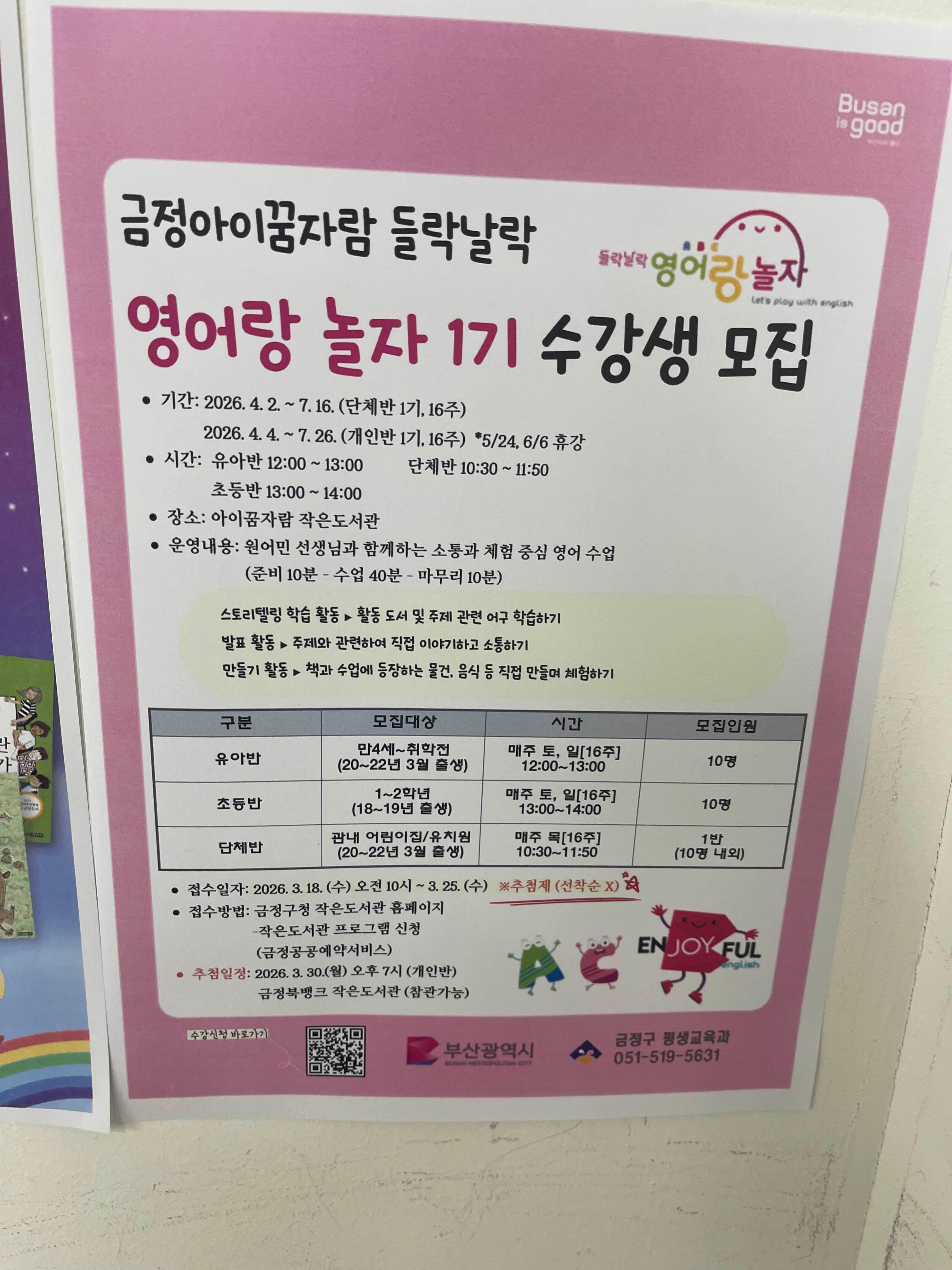 금정 아이꿈자람 도서관에서 영어랑 놀자 1기 모집한다고 합니다.