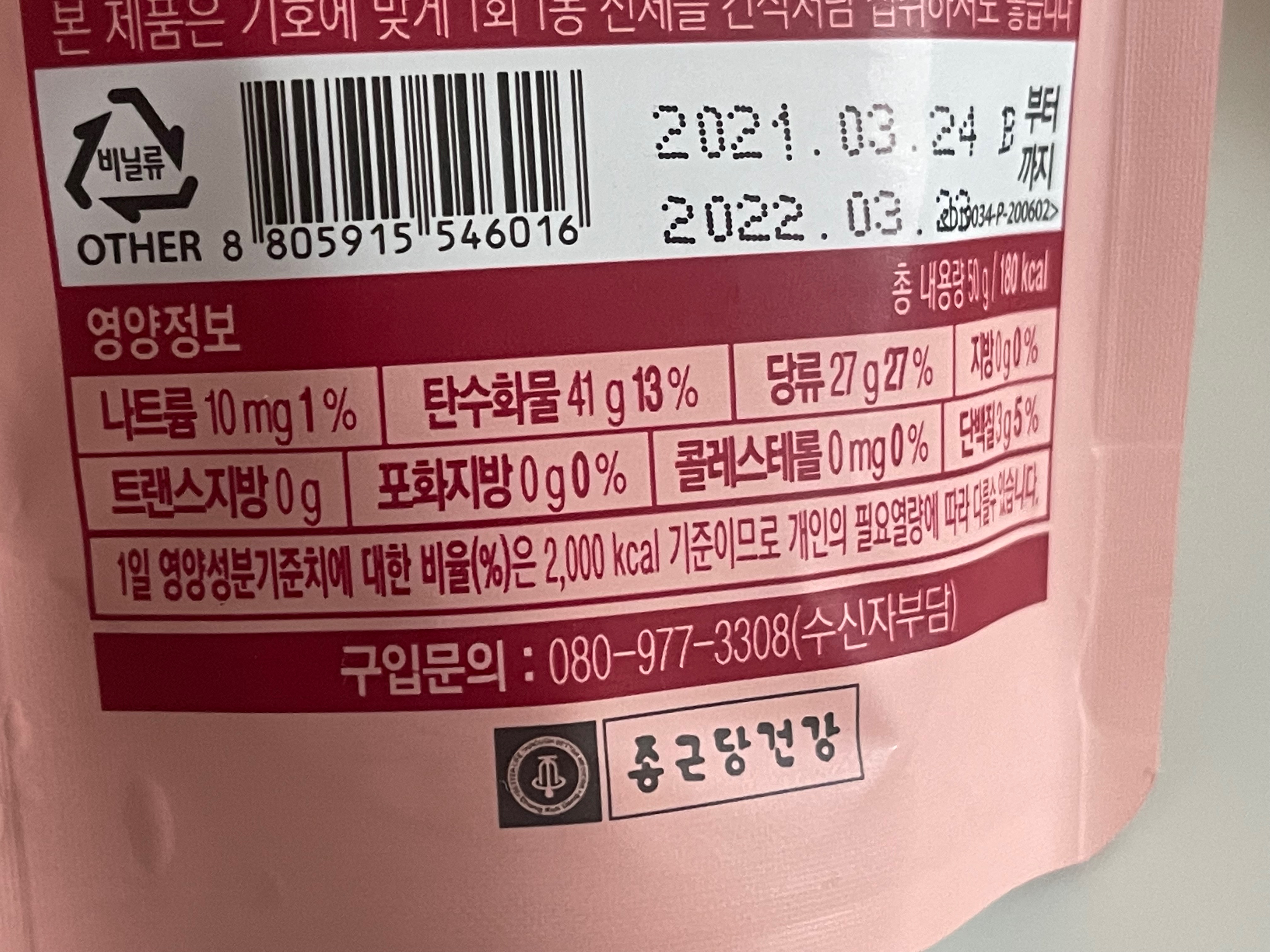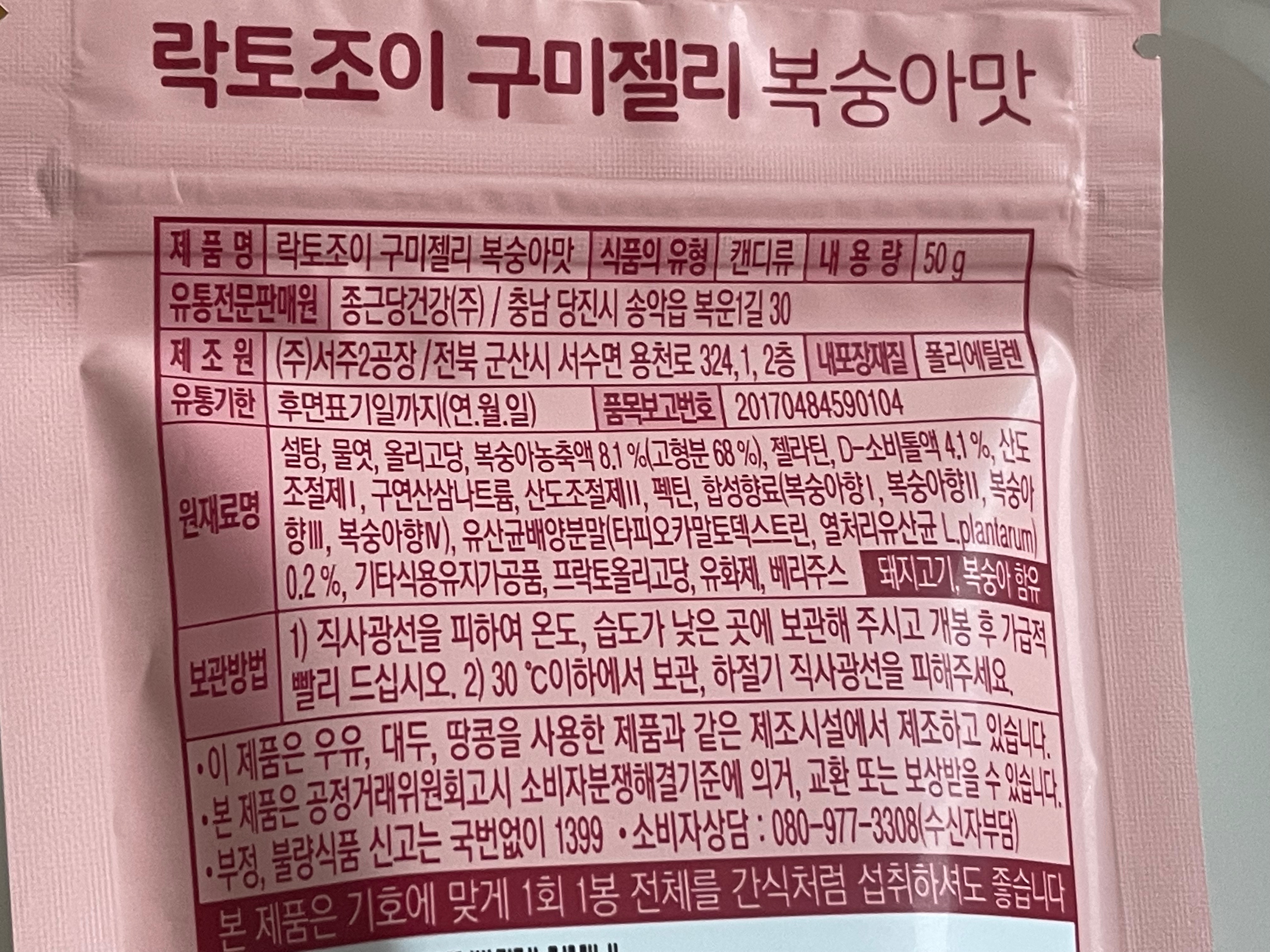 원재료명 설탕 물엿 올리고당 복숭아농축액8.1% 젤라틴, D-소비톨액 4.1% 산도조절제 I