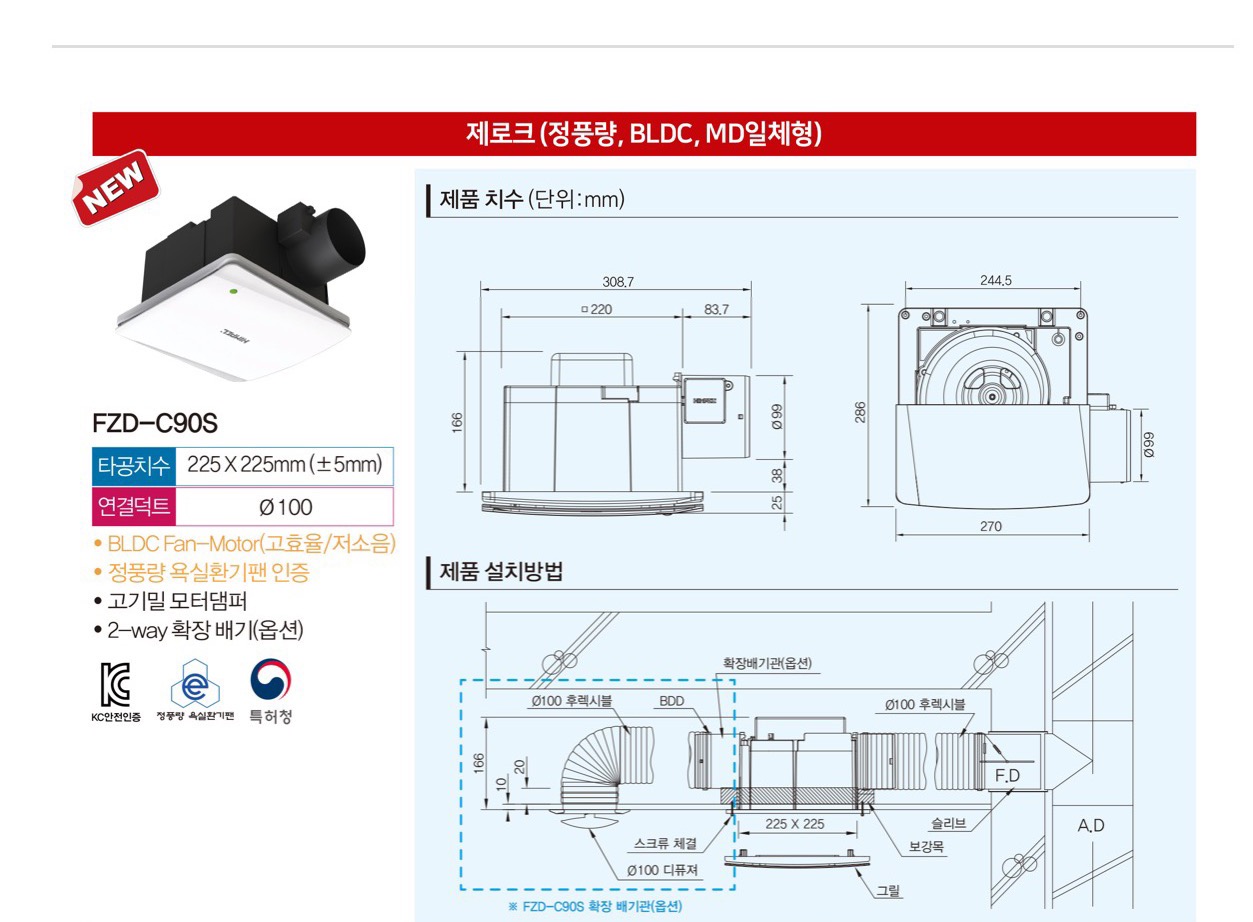 정압 25~250Pa 이내에서 풍량이 60CMH이상