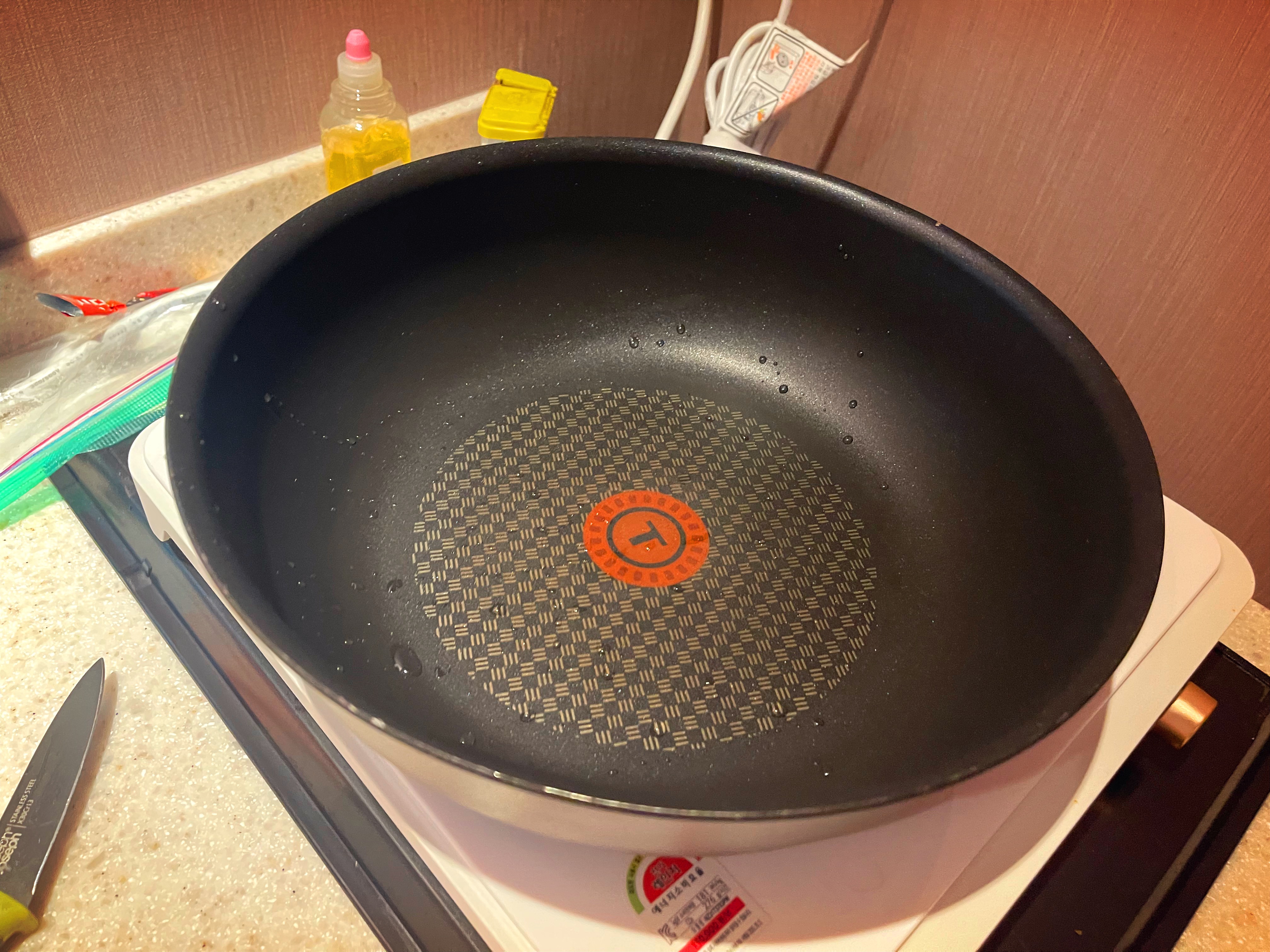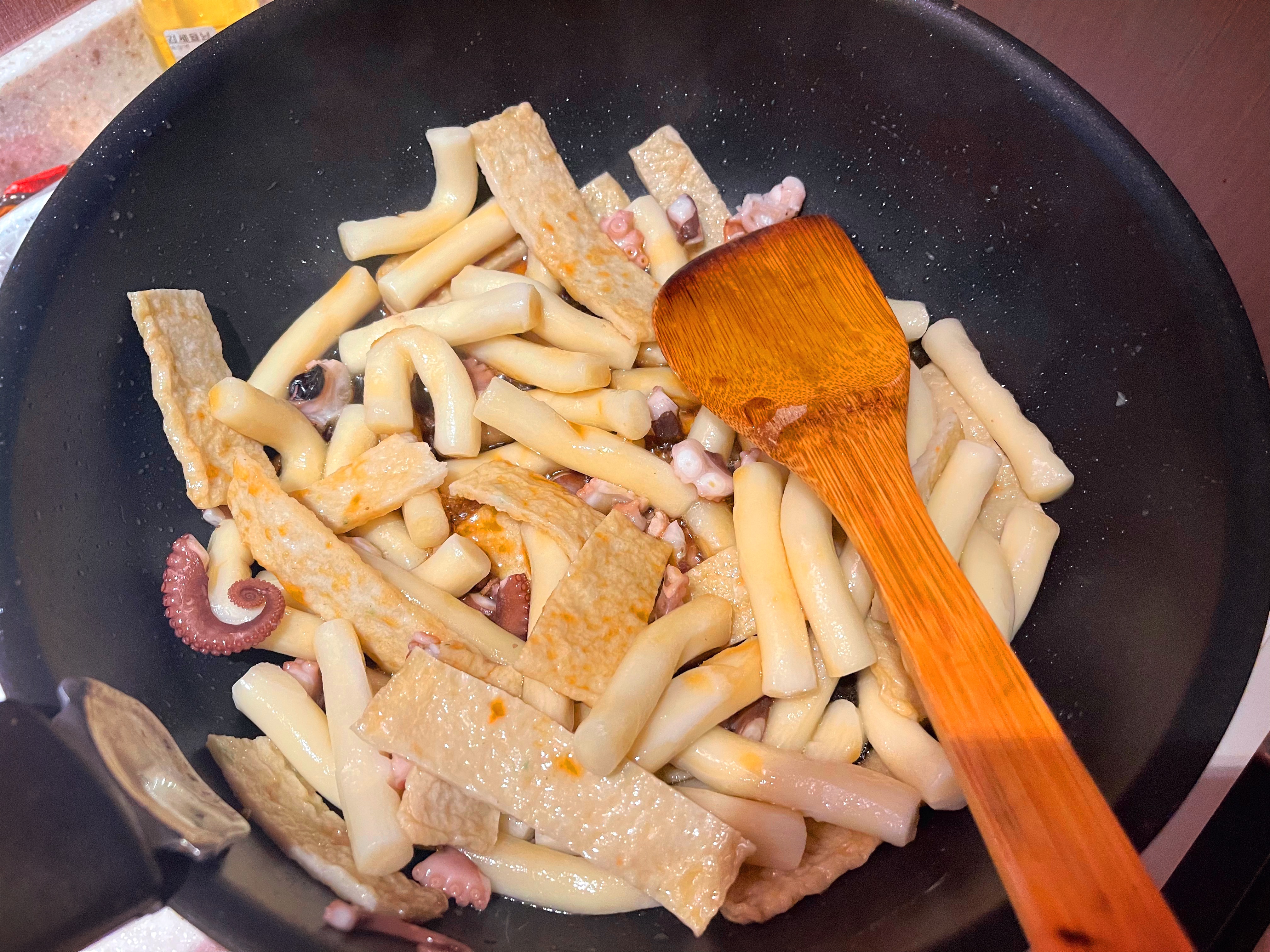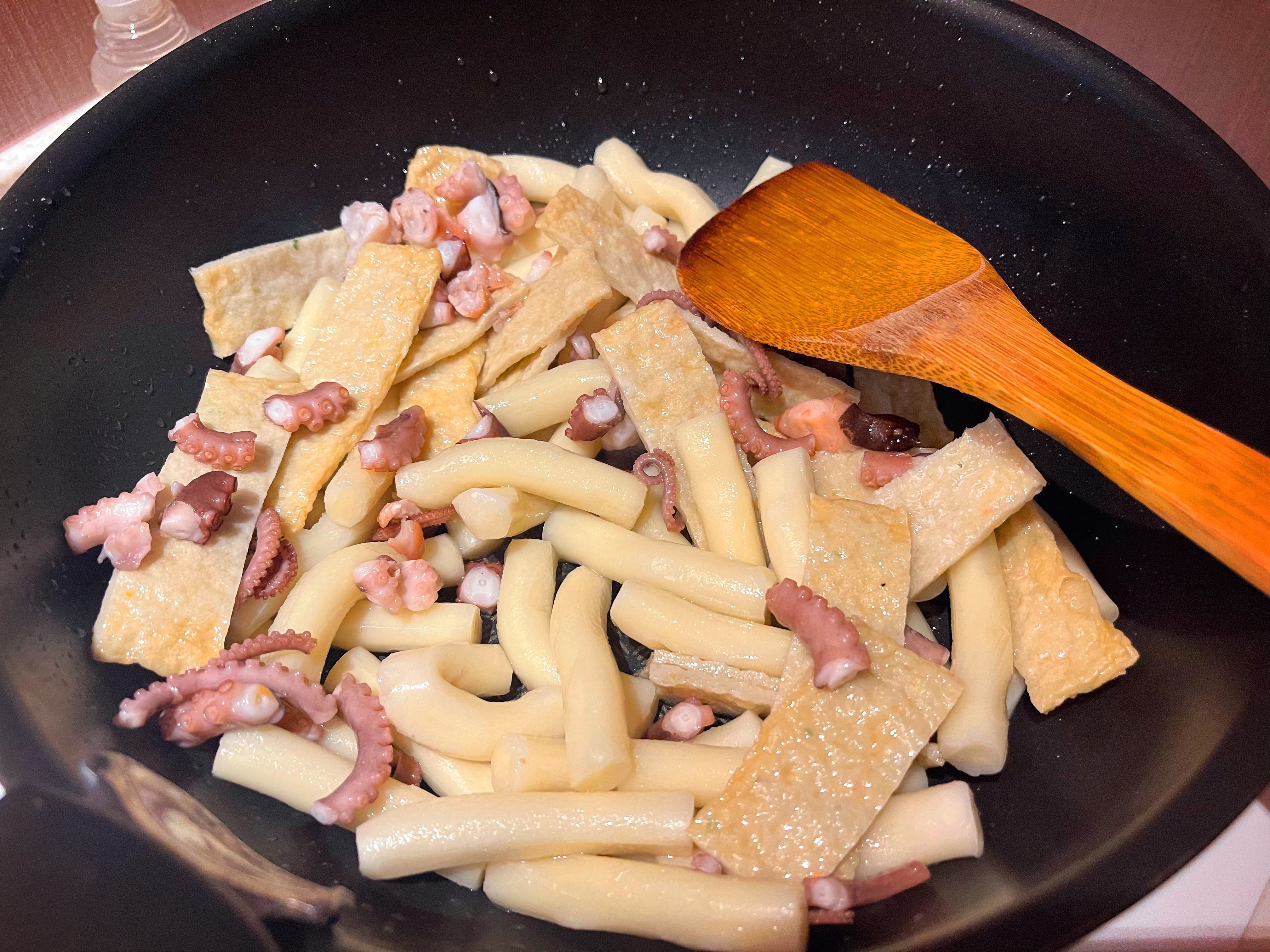 2. 찰떡, 빨강소스, 깜장소스, 식용유 1스푼을 넣고 센불에 1~2분간 볶습니다.