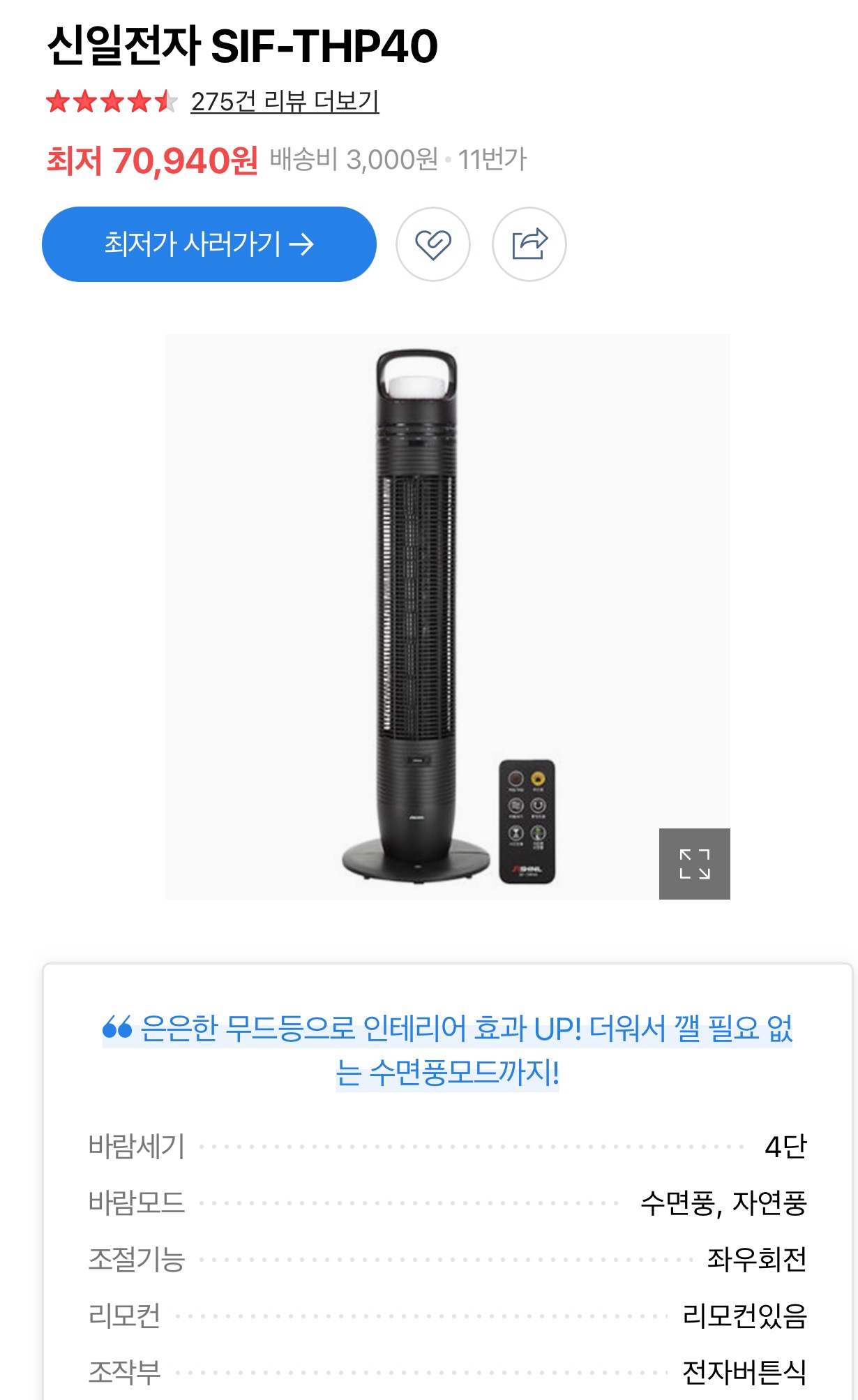 그래서 만족하고 신일타워형선풍기 한개를 더 샀습니다.