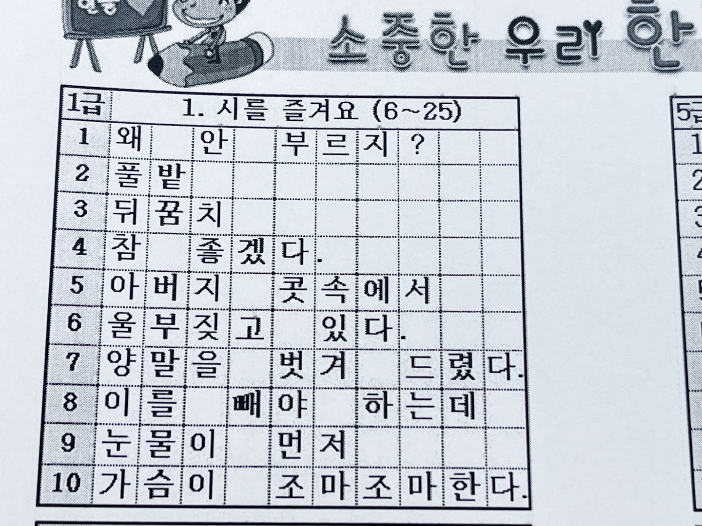 초등학교 2학년 받아쓰기 급수표 있다고 했는데, 친구가 2학년 2학기꺼 맞냐고해서 보니 그건 2학년 1학기 2학년 1학기는 1급이 시를 즐겨요 로 시작, 2학녀 2학기 받아쓰기 급수표는 장면을 떠올
