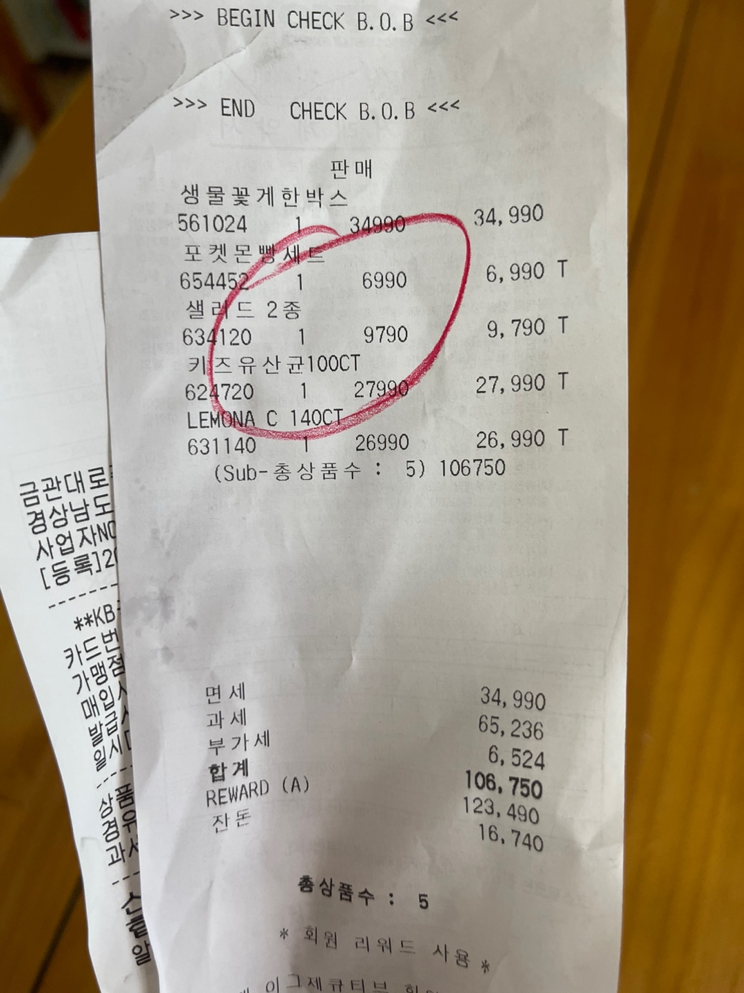 제가 장본금액이 106750원, 리워드 사용하시겠습니까? 네~!