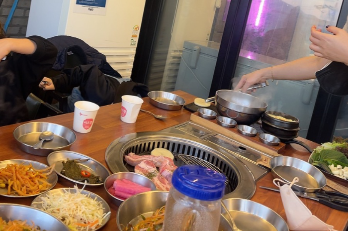 아이다섯 엄마세명 입장과 동시에 창가쪽으로 안내를 받았으며 테이블 세팅은 빠르게 이루어졌습니다. 천정이 열리는 자동시스템이었는데, 아직 날씨가 쌀쌀해서 일단 닫고 고기를 구워먹다가 식당내에 연기가 좀 찼다 싶을무렵 천장을 열어주셨습니다. (자동시스템 헉) 순간 찬공기였지만 맑은공기가 한번에 들어오는것이 기분이 좋았습니다. ^^ (우와~~~~ 이러면서)