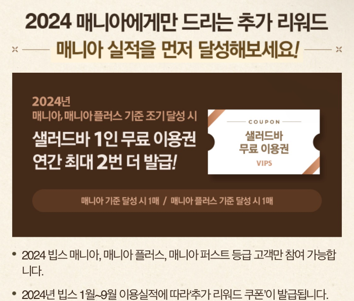 2024년 매니아, 매니아 플러스 기준 조기 달성 시 샐러드바 1인 무료 이용권 연간 최대 2번 더 발립!