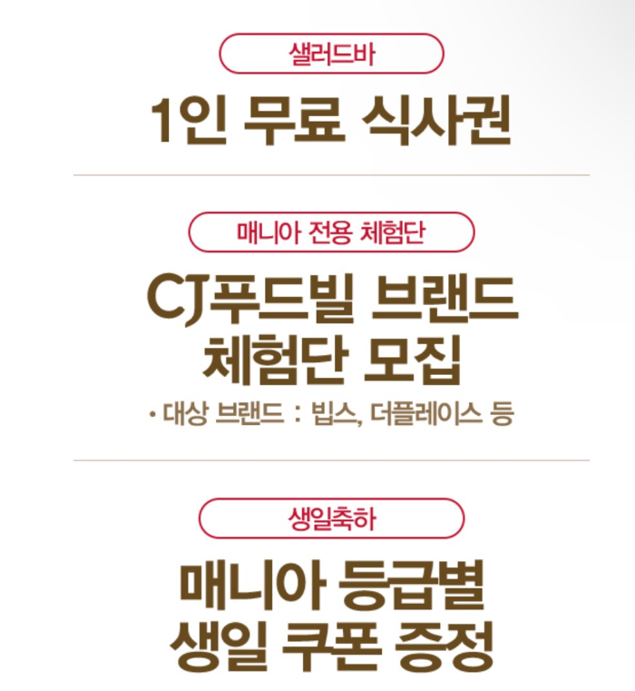 • CJONE 회원 탈퇴 또는 푸드빌 약관 철회 시, 이용실적이 모두 삭제되어 매니아 혜택을 받을 수 없습니다.