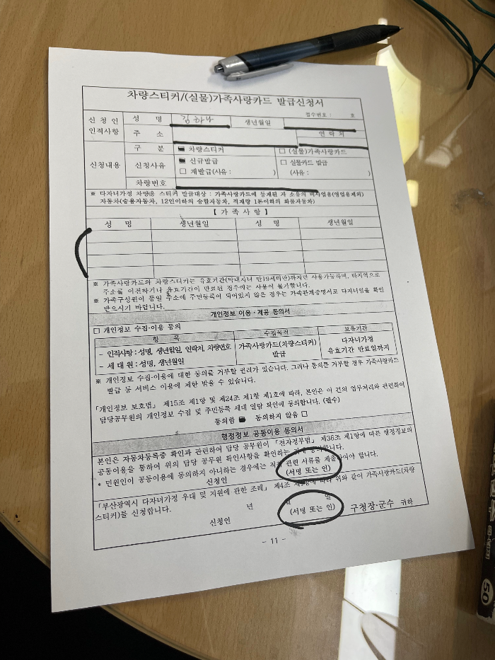-직원분이 서류를 주신 서류를 작성 : 차량번호, 이름, 주소, 가족사항 기입 및 서명