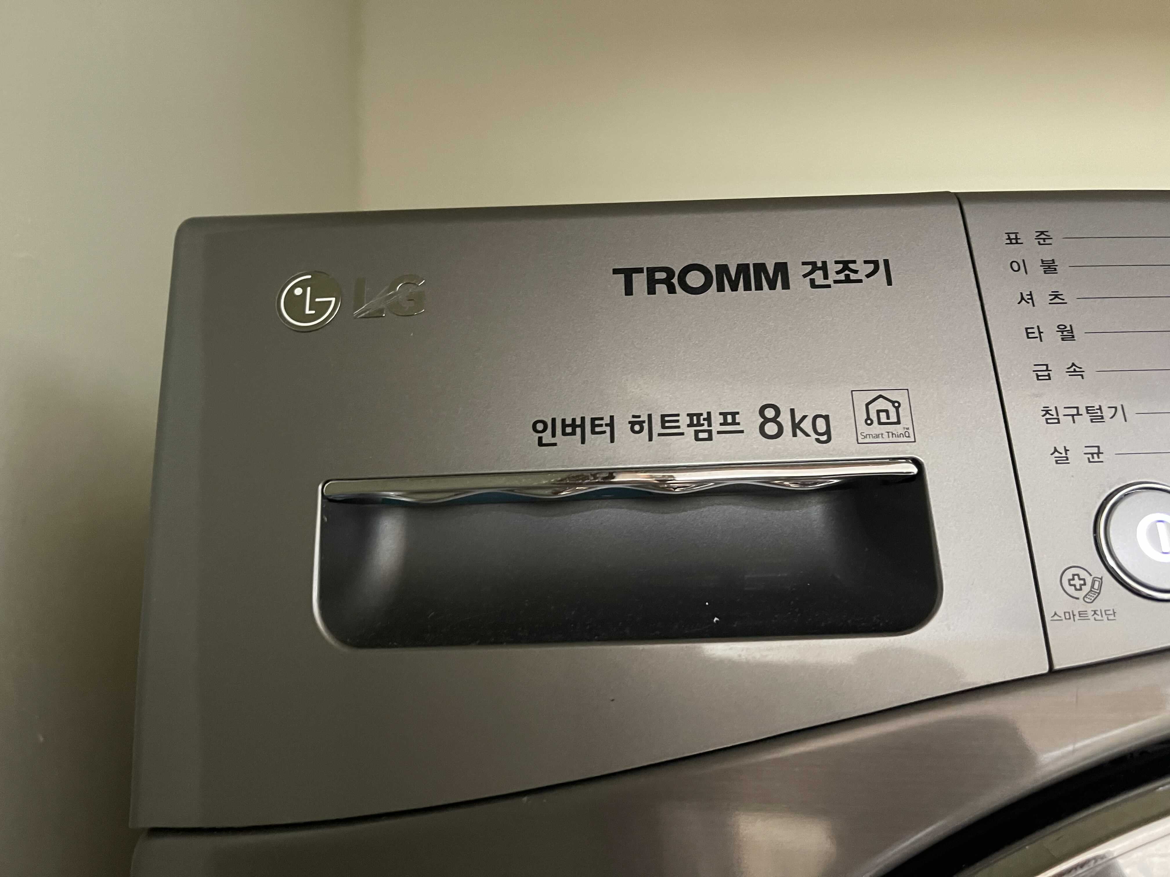 둘째 조리원에 있을때 설치했던 건조기라, 그때 8kg 트롬 건조기를 샀는데, 요즘은 20kg대다 보니, 건조기가 작게 느껴지긴 해요. 요즘은 16kg 세탁기에 세탁을 한후