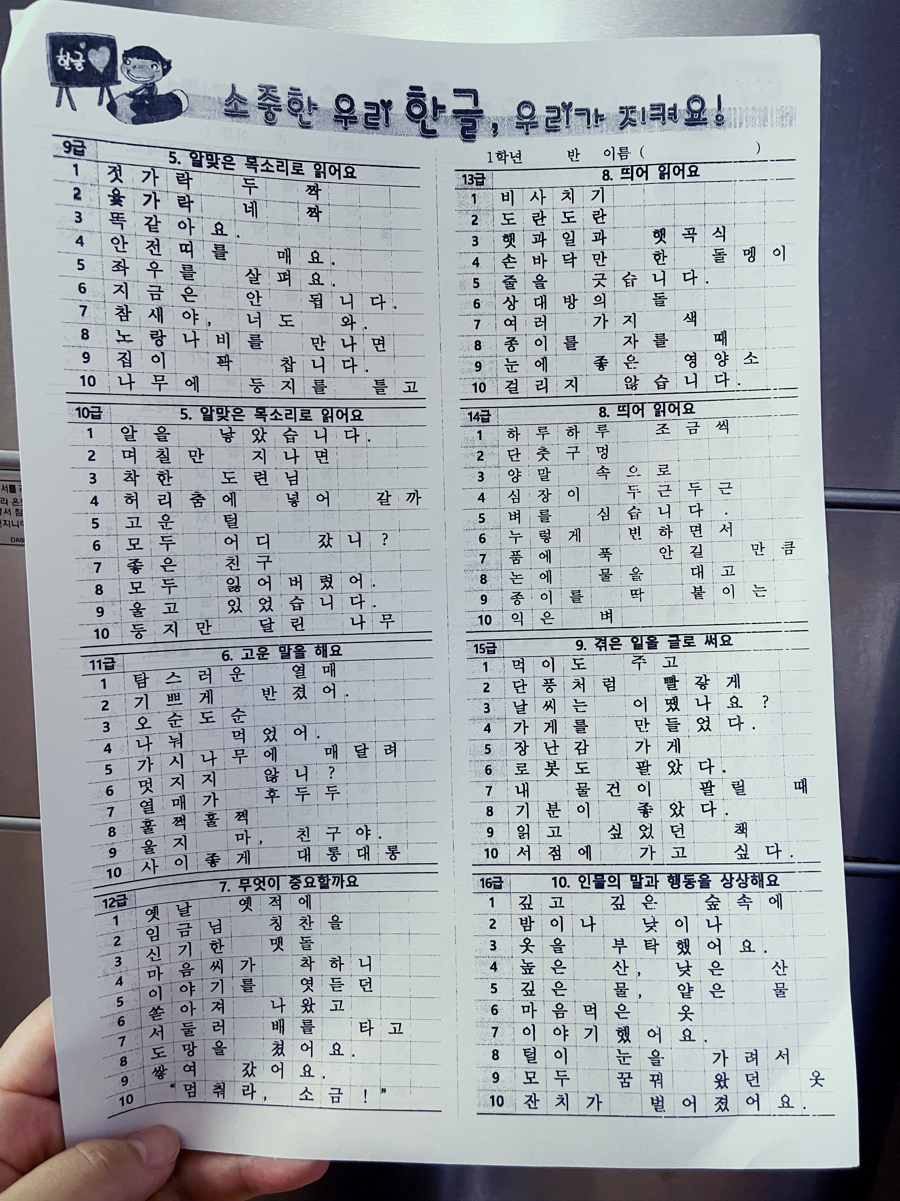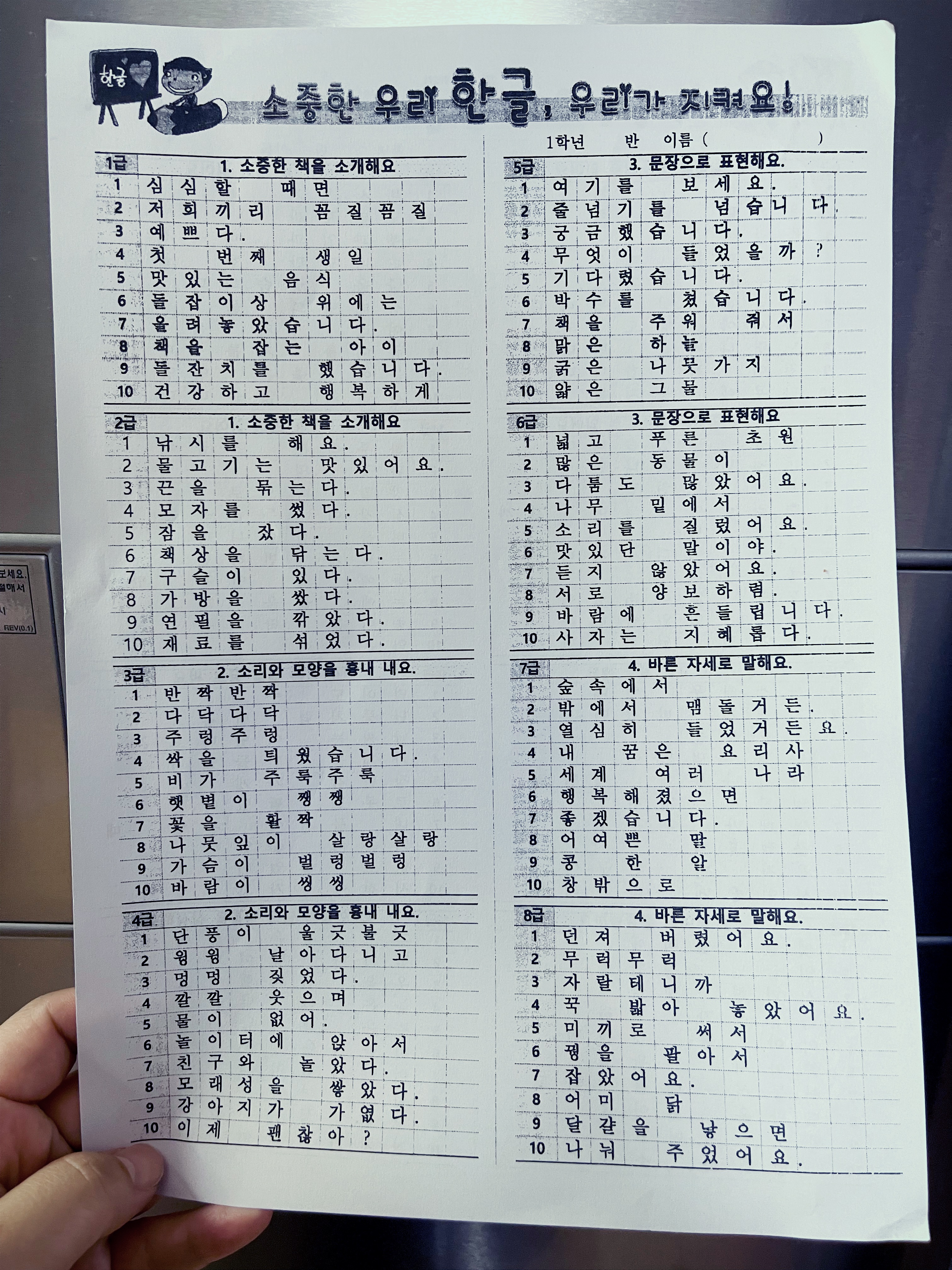 받아쓰기 급수표 잘 보관